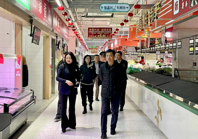 考察團一行在項目負責人的帶領下還參觀了公司智能生鮮柜投放點以及市投集市未來路市場,并就市場運營模式、功能定位、特色優勢等方面進行深入交流。